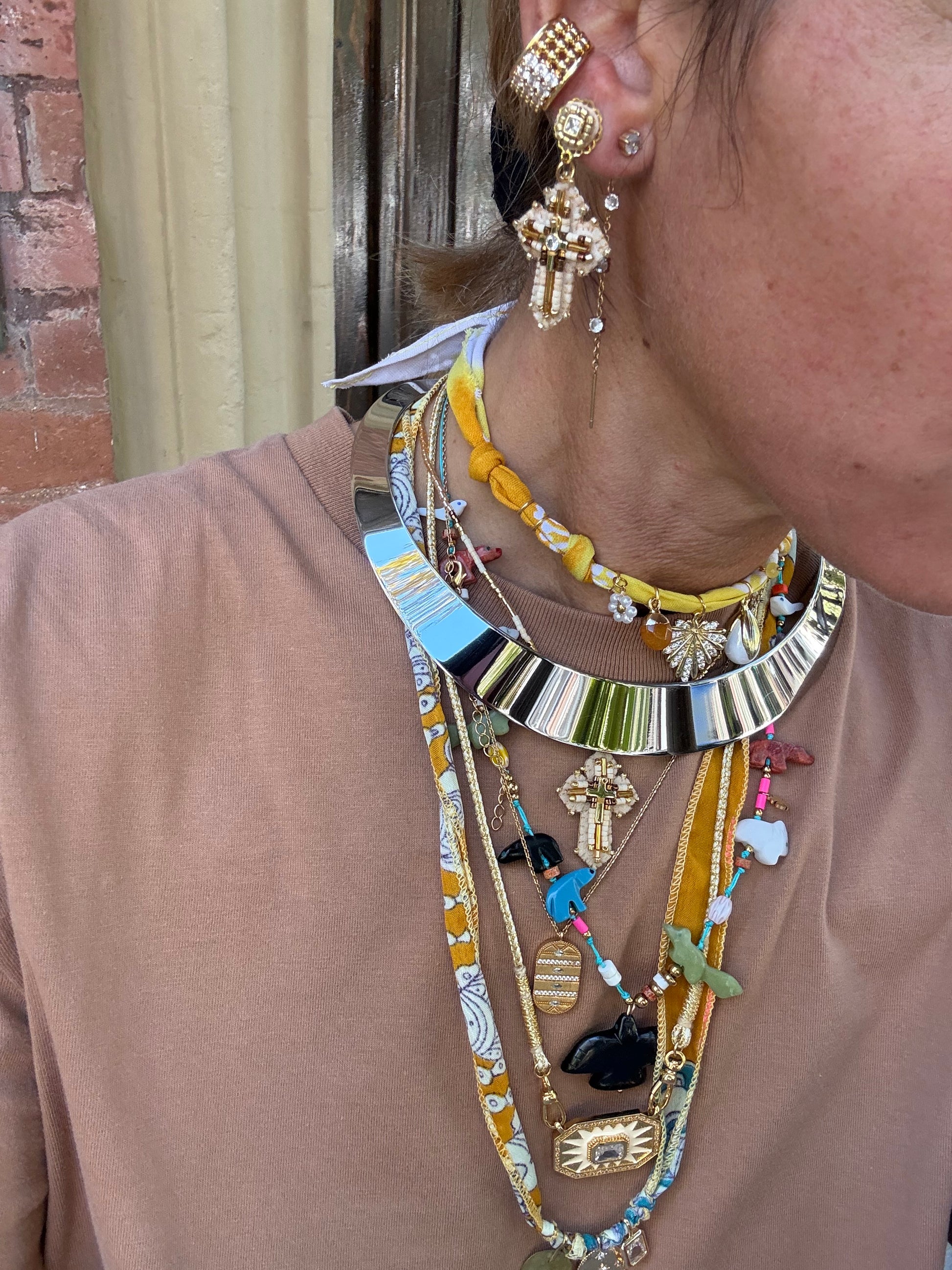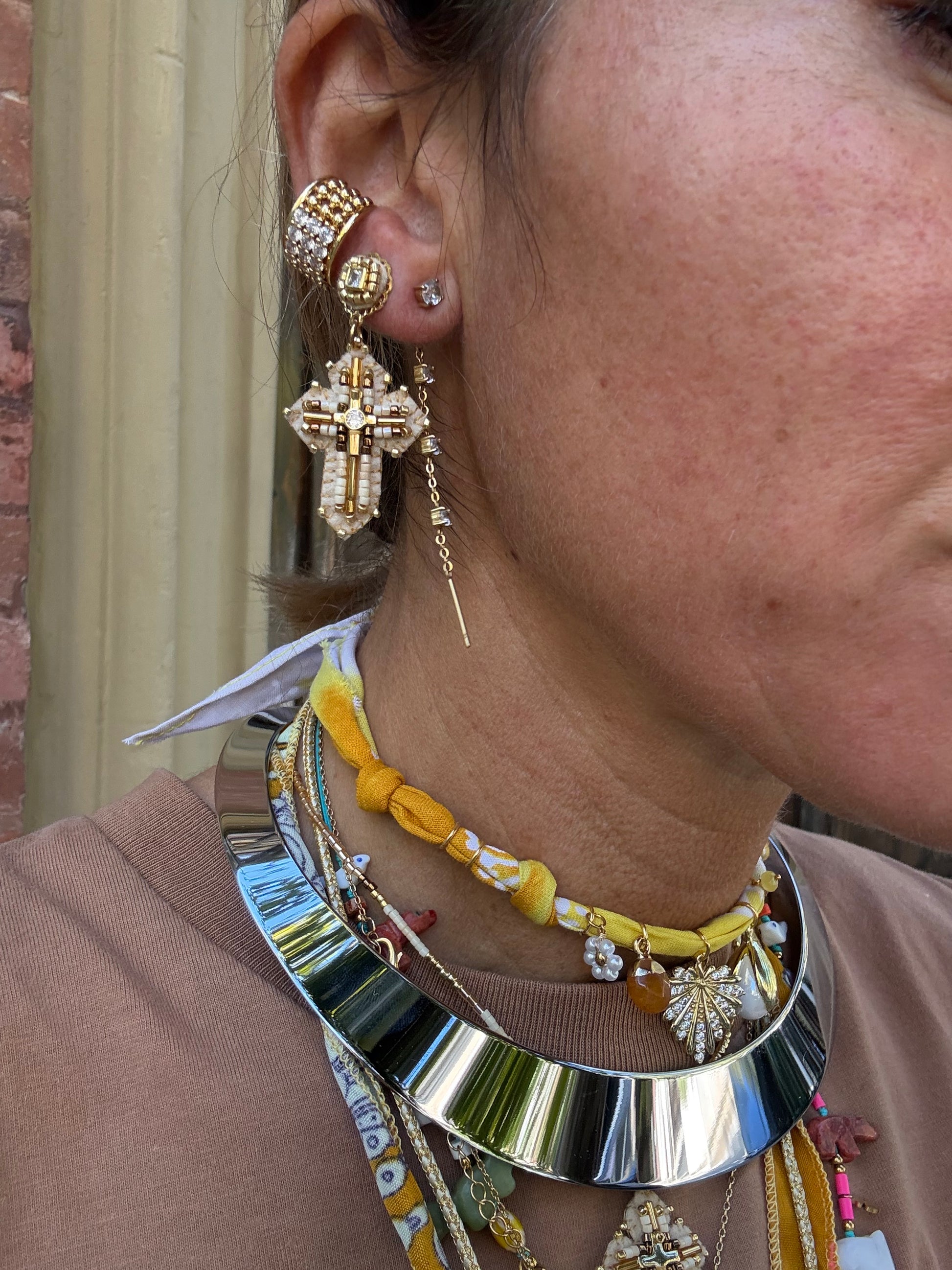 Orecchini Croce in feltro con perle di Miyuki, perle dorate e strass centrale.