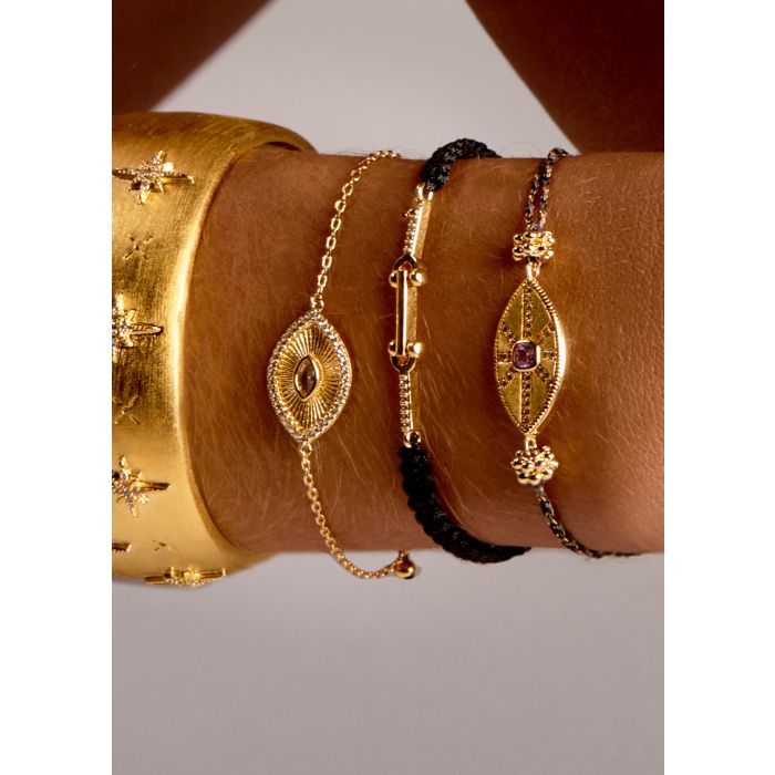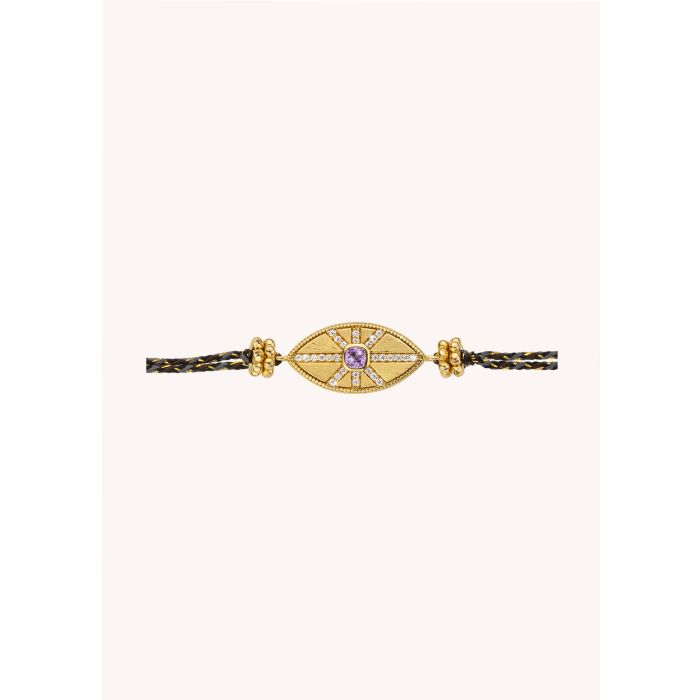 Instonato su un cordoncino nero tessuto con fili dorati, presenta uno strass viola brillante al centro - un lampo di colore vibrante che attira l'occhio. La combinazione di luccichio dorato e viola intenso lo rende una dichiarazione piena di personalità.