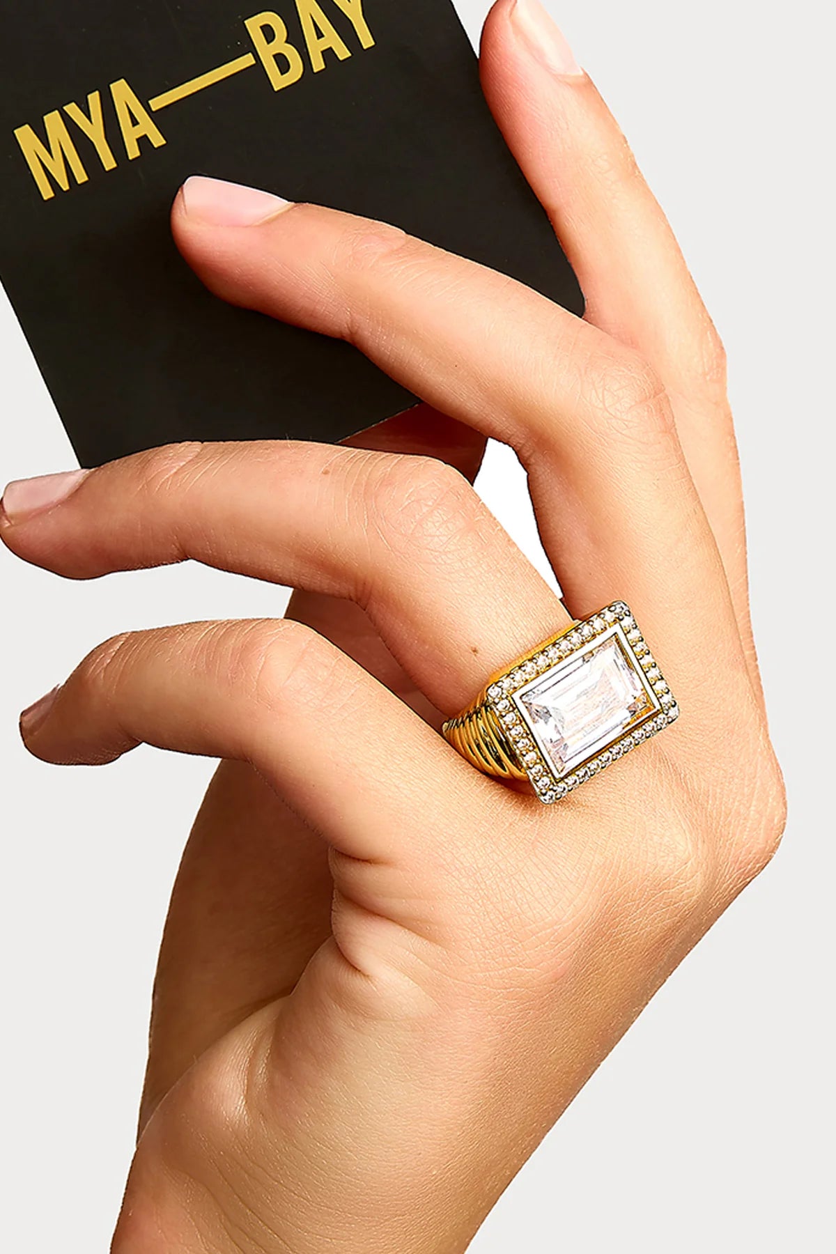 L'anello WHITE STONE SOFIA di MYA—BAY rende omaggio all'eleganza sgargiante di Sofia Loren, una musa italiana con gusto sicuro e gioielli spettacolari.