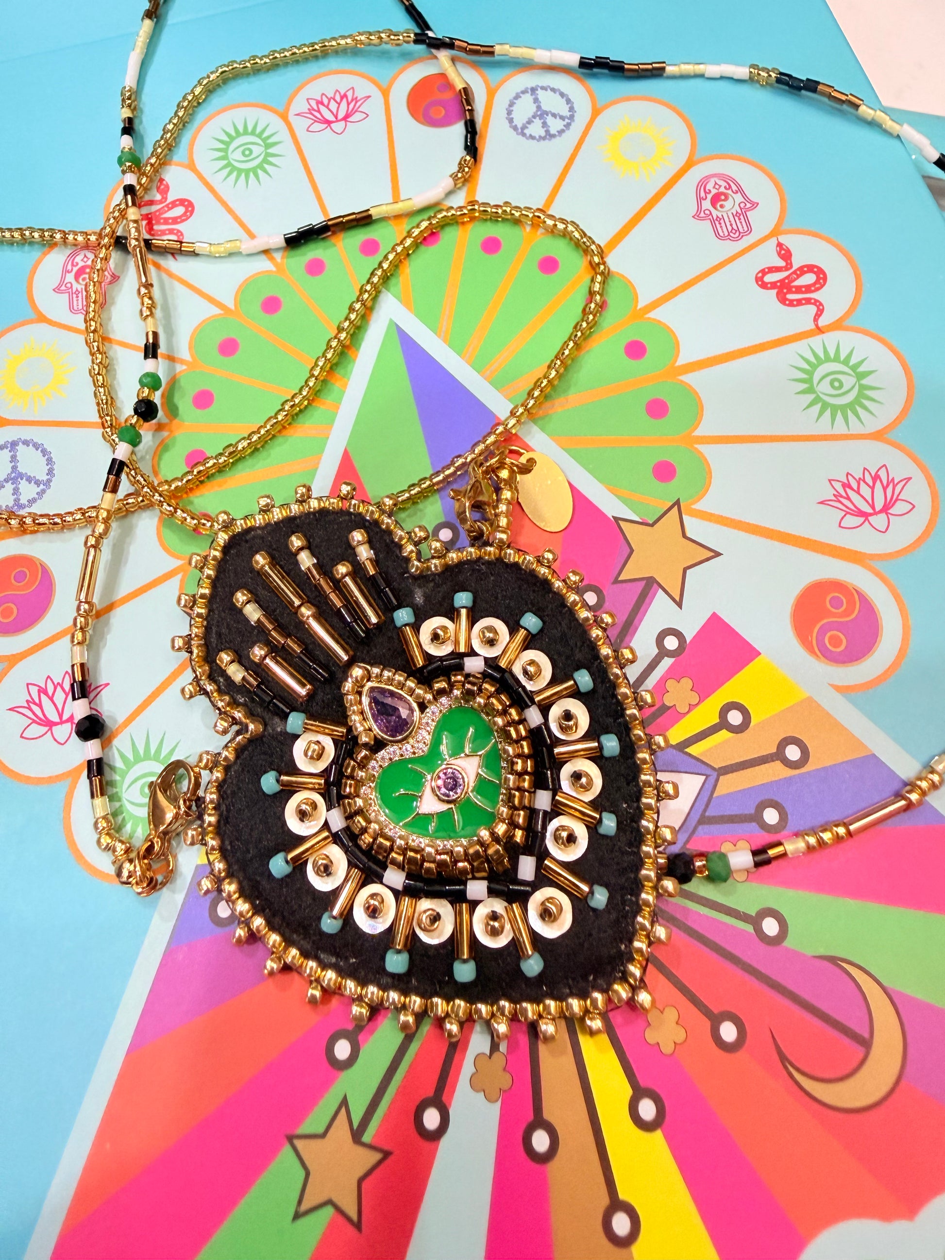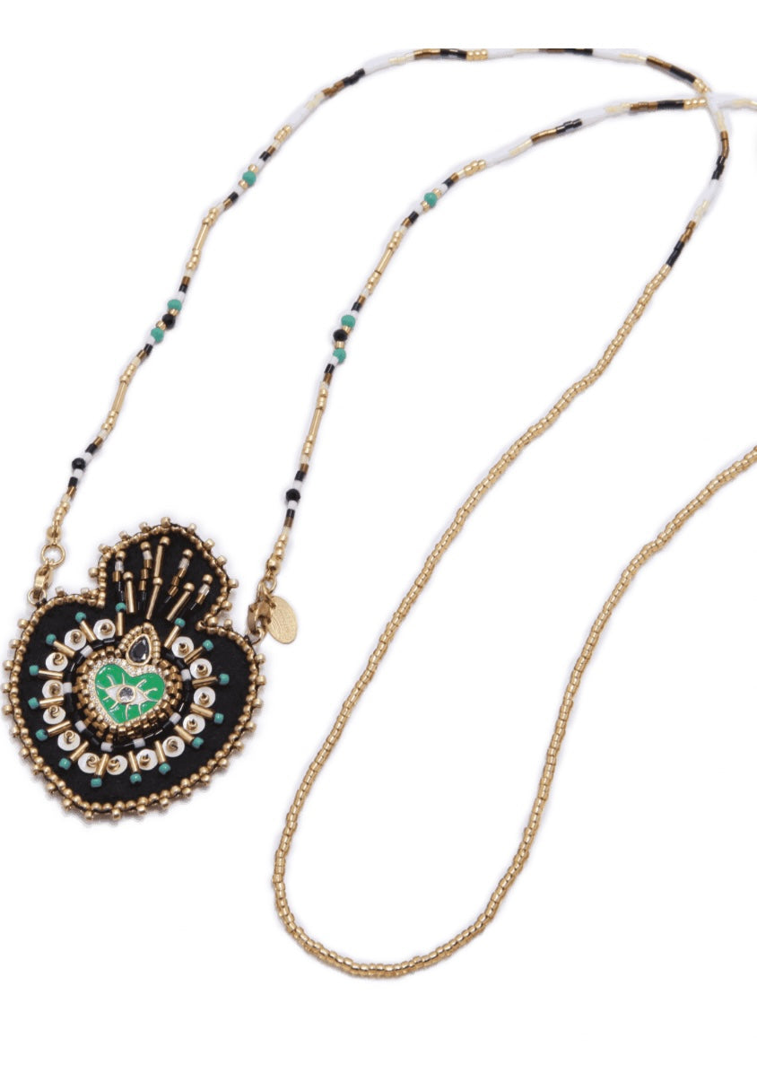 Sautoir Fantaisie Ex Voto Collana in perla di Miyuki e ciondolo in feltro con perline e simboli