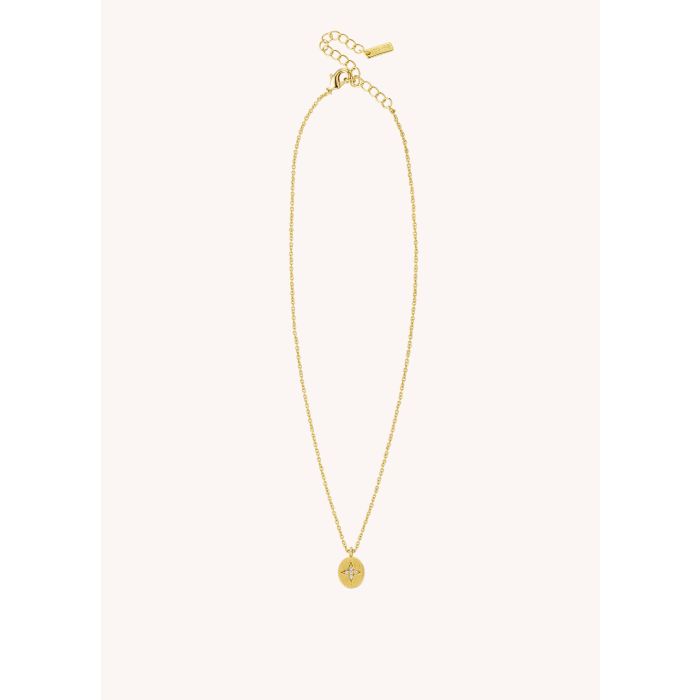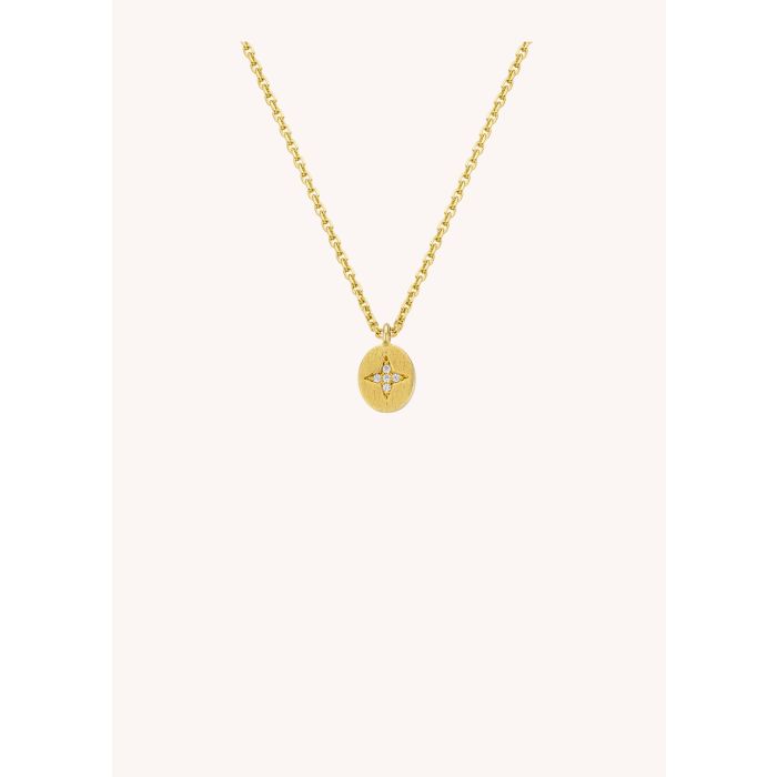 Il suo piccolo medaglione d'oro spazzolato, adornato con una scintillante stella di cristallo, pende da una catena fine. Un pezzo minimalista e luminoso, perfetto da indossare giorno e notte.